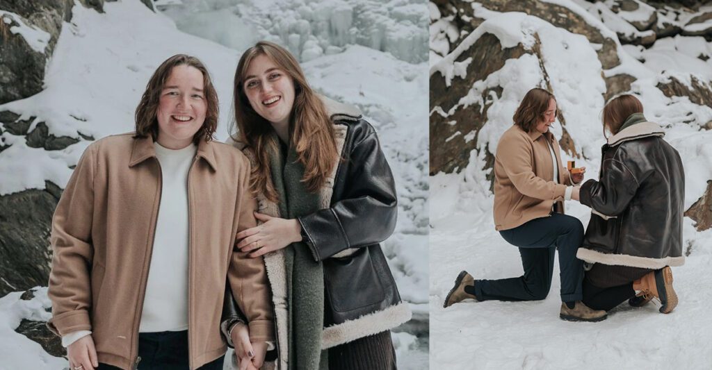 Fast forward to January 2025: I’m standing at the bottom of a frozen waterfall in Vermont, with Melanie on one knee in front of me. It was an instant yes, happy tears freezing to our faces.